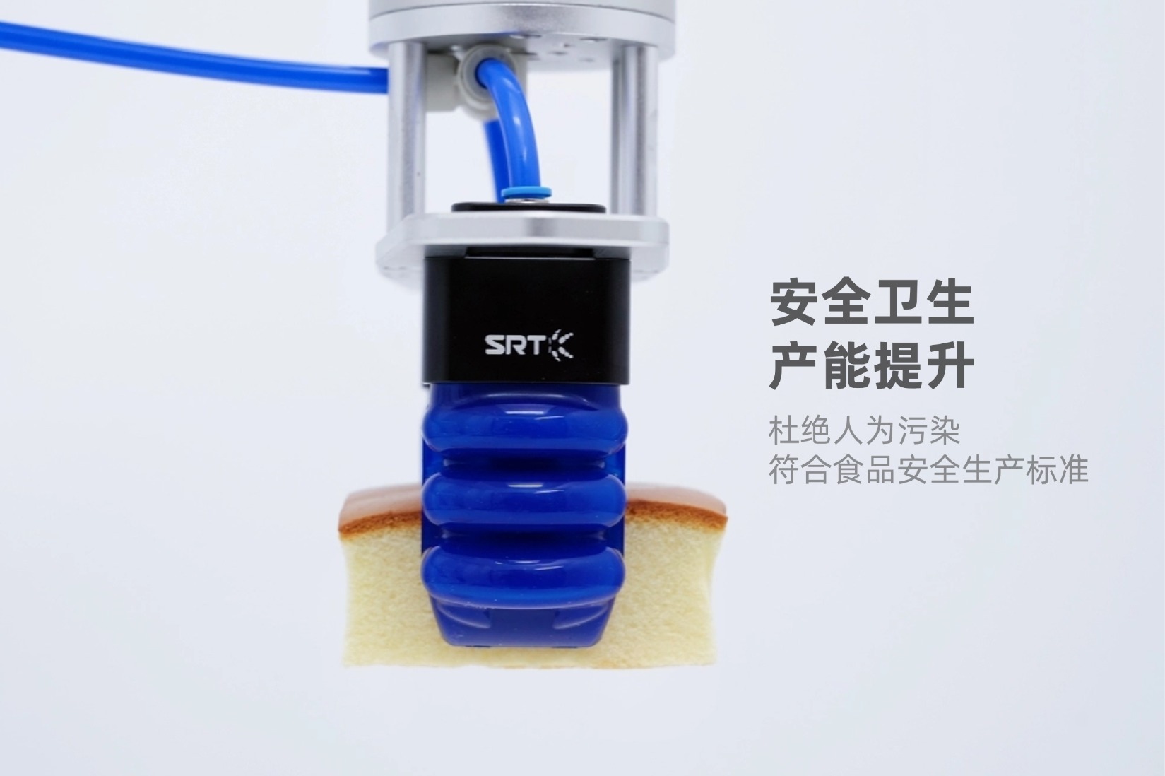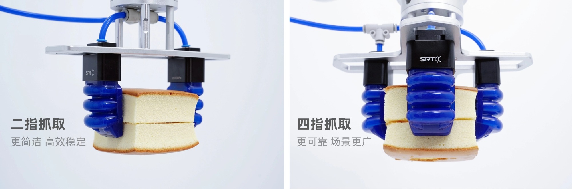 某烘焙企业专注蛋糕产品的规模化生产,其核心诉求是实现成品蛋糕从双层堆叠到分拣环节的自动化抓取。该类蛋糕具有柔软怕挤压、表面褐变皮层易刮花等物理特性,同时生产过程需满足食品级卫生、高速连续作业、低损耗的要求,这让传统自动化方案陷入两难——人工抓取效率低且存在卫生风险,常规刚性夹爪与真空吸盘方案则频繁导致产品破损、表面污染,成为制约产能升级的关键瓶颈。基于仿生学原理和软体机器人技术的SRT柔性末端执行器,通过针对性的技术适配,为该客户实现了“无损、高效、合规”的自动化升级。