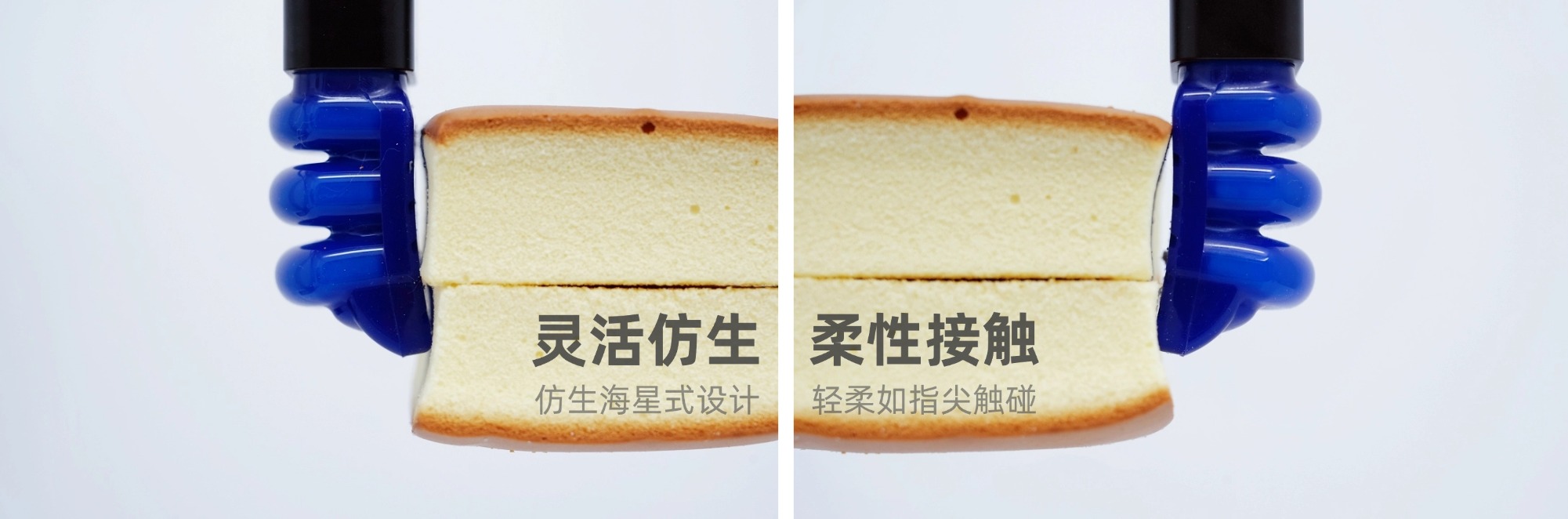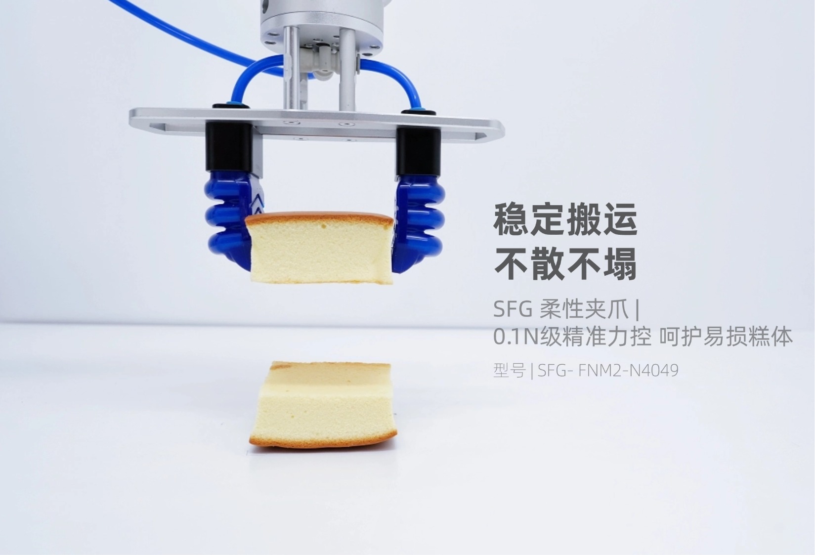 l 夹爪本体采用FDA认证食品级硅胶材质,具备适宜的柔软度,可模拟人类手指的包覆式抓取,分散与蛋糕的接触面积,避免局部压力集中导致的蛋糕变形。